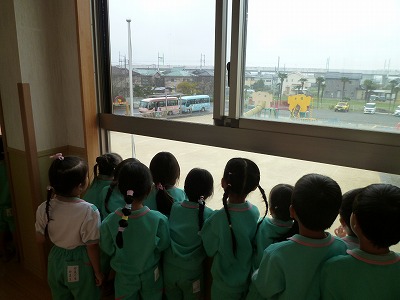 年中さん、年少さんに見送られて出発しましたが、雨が強く降ってきてしまい園に戻ってきました。