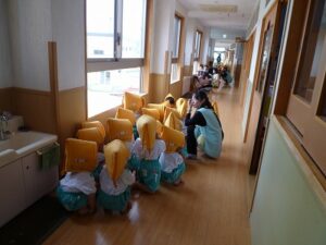 年中さん、年少さんに見送られて出発しましたが、雨が強く降ってきてしまい園に戻ってきました。