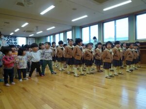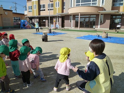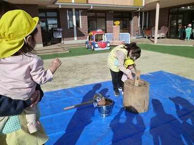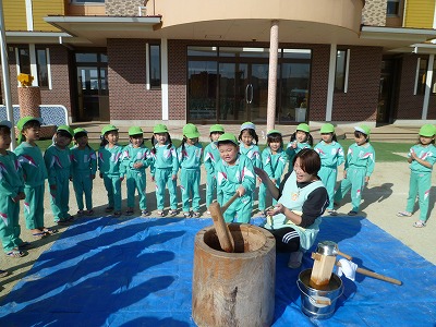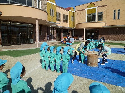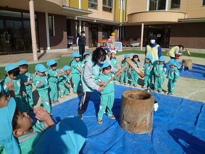 まだまだ子どもたちには大きな杵ですが先生たちに手伝ってもらいながら順番に大きな掛け声をかけて頑張りました!!
