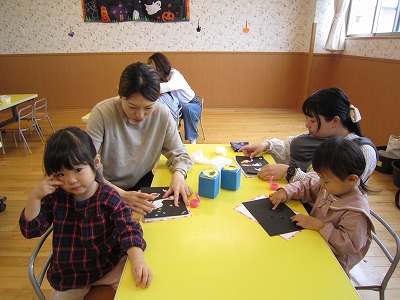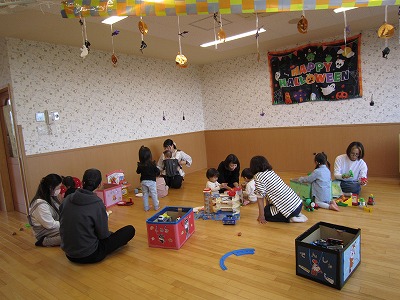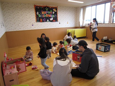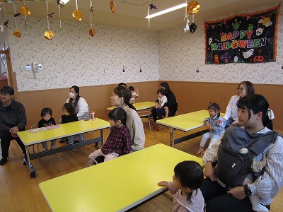 ハロウィン飾りのお部屋での読み聞かせも興味津々だった子どもたち。