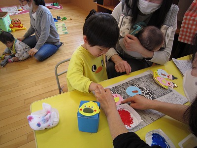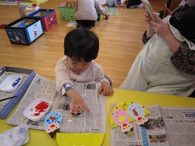 絵の具を指につけて、チョンチョンと紙に押し、素敵な着物ができました。