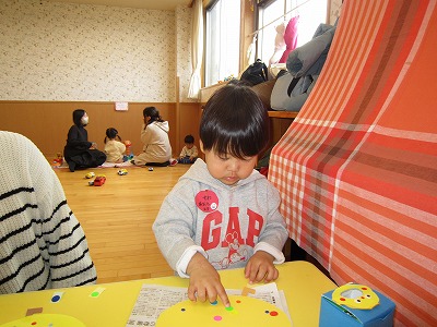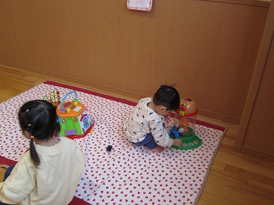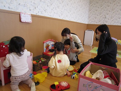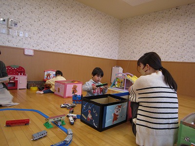外はみぞれが降り、とても寒い日でしたが、室内ででんしゃやおままごと、すべり台